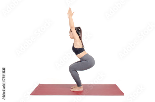 Side View Of Young Asian Woman Doing Yoga In Utkatasana Or Chair