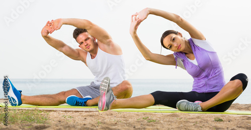 Couple Doing Yoga Poses Sitting On Sea Beach Buy This Stock Photo