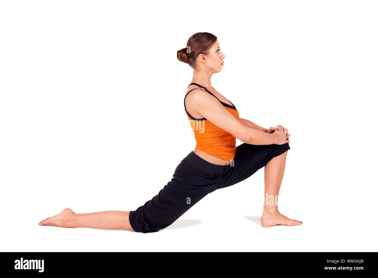 Woman Practicing First Stage Of Yoga Pose Called Crescent Lunge