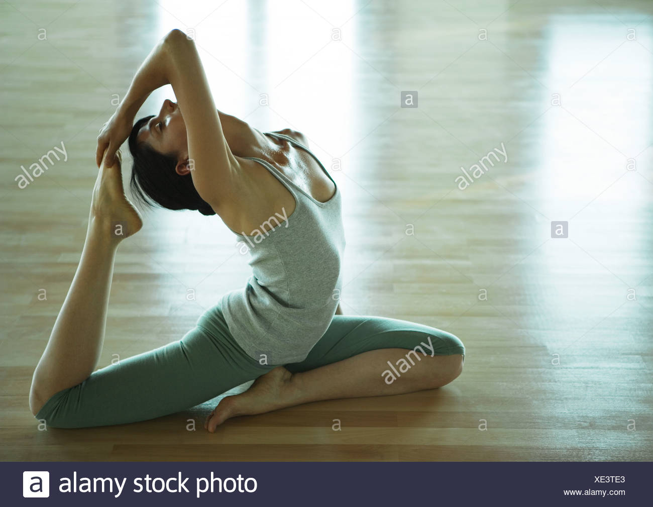 Asian Female Practising Yoga In One Legged King Pigeon Pose Stock