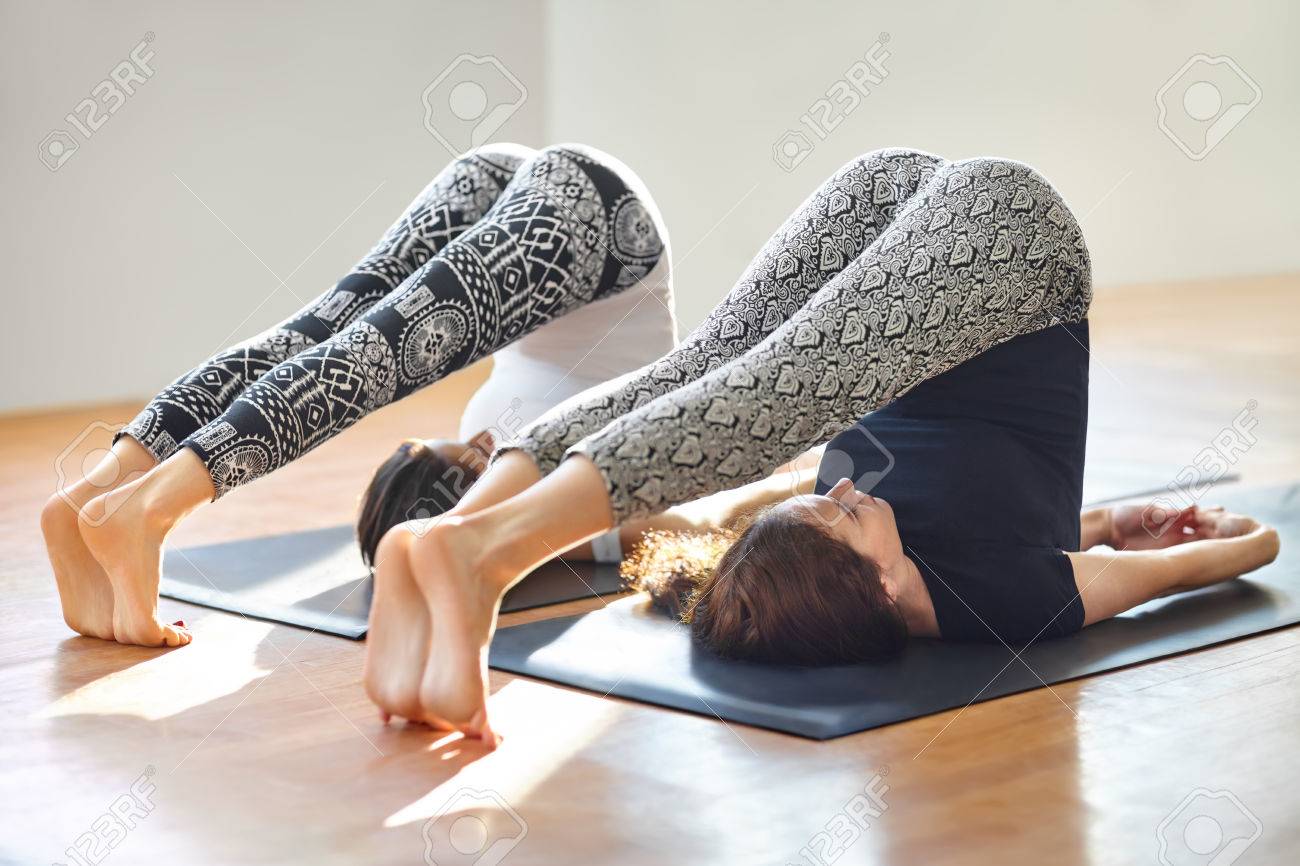 Two Young Women Doing Yoga Asana Plow Pose Halasana Stock Photo