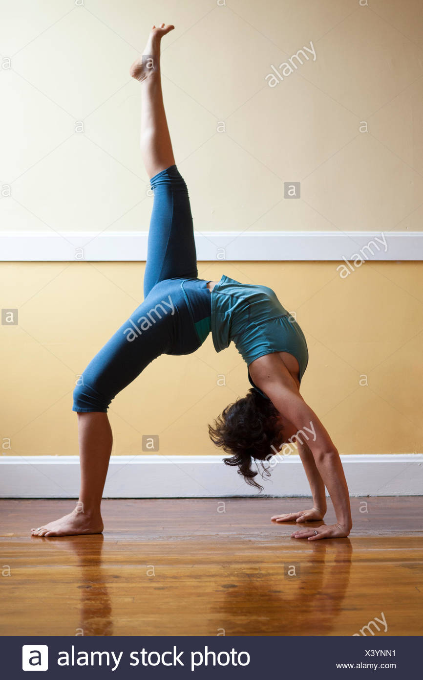 Real Yoga Instructor Is Doing Complicated Yoga Pose Stock Photo