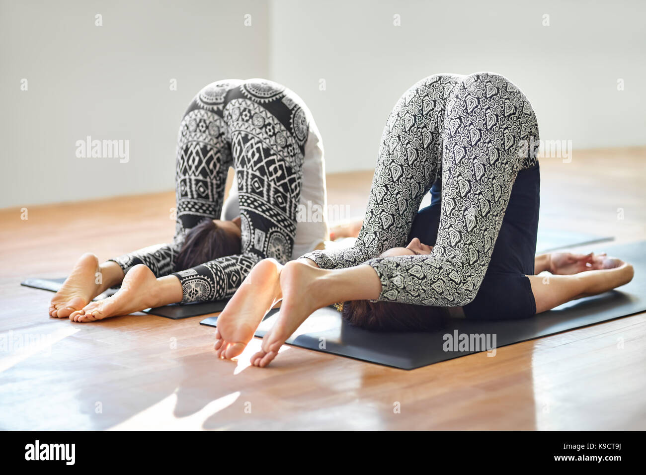 Two Young Women Doing Yoga Asana Easy Plow Pose Purva Halasana