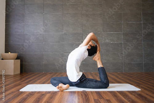 Indian Yogi Doing King Pigeon Yoga Pose In Gym Man Practicing